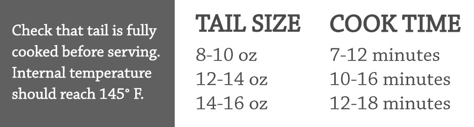 3. Place tail on a cookie sheet. Generously baste tail with melted butter, or set a few butter pats on top. Place tail in oven and cook according to the cooking times listed below (roughly 1 minute per ounce).