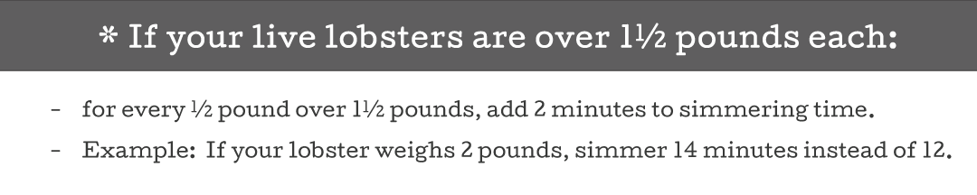 3. For 1 1/2 pound lobsters, simmer for 12 minutes* (see below for bigger sizes). Remove lobster from water & serve with butter and lemon.